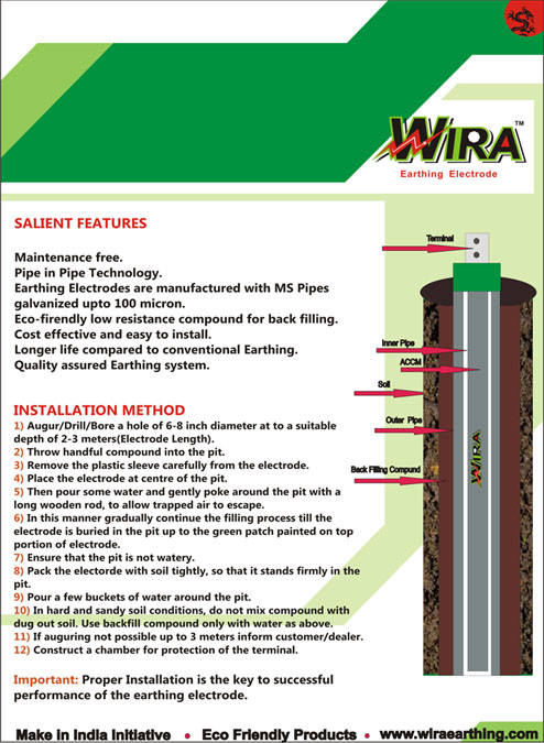 Wira Earthing is made of mild steel pipes having galvanization of 100 microns. We use pipe in pipe electrodes is filled with anti corrosive and highly conductive mixture (ACCM).