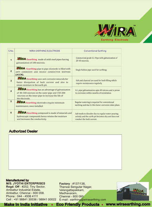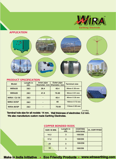Wira Earthing Electrode compound is made of minerals and hydroscopic compounds hence retains the moisture and increases the conductivity whereas ordinary salt tends to dissolve due to regular water pouring activity and the earth pit becomes dry and does not conduct the fault current. |